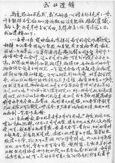 在遗愿里,吴征鉴条理清晰地列明了自己的遗体可做的用处——“去世之后,赶紧做尸体解剖,希望利用它作为研究材料,不仅要查明死亡原因,而且能找出发病原因……我想尸体解剖如果做得多,做得细,再和病例身前病历结合起来分析研究,一定能够为今后诊治疑难病症提供新的技术和经验。”
