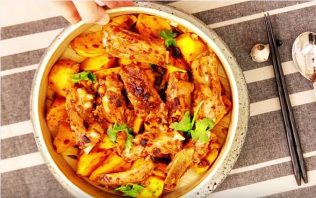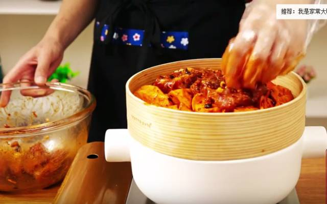 3、把腌制好的红薯和排骨放入蒸锅里,盖上锅盖,蒸上40分钟就可以打开锅盖开始盛盘了;