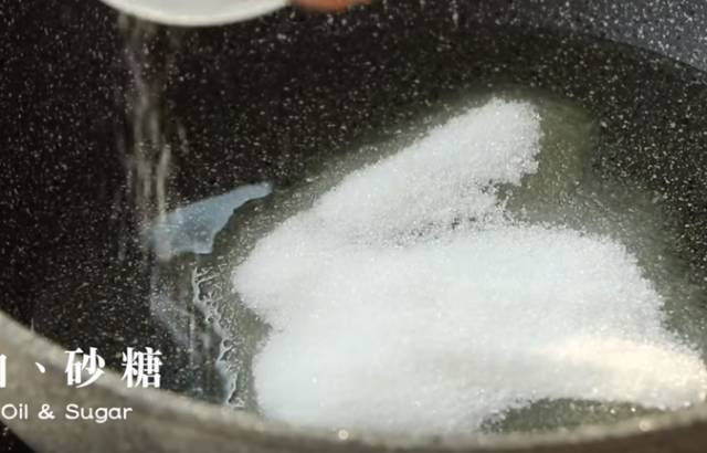 3、在锅中倒入油,再倒入砂糖,油和砂糖的比例需要是1:2,用小火拌炒至微焦糖色;