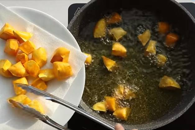 2、在锅中热油,用筷子戳油到冒泡泡的状态,就可以把红薯放进炸了,把红薯块炸成金黄色就可以起锅了;