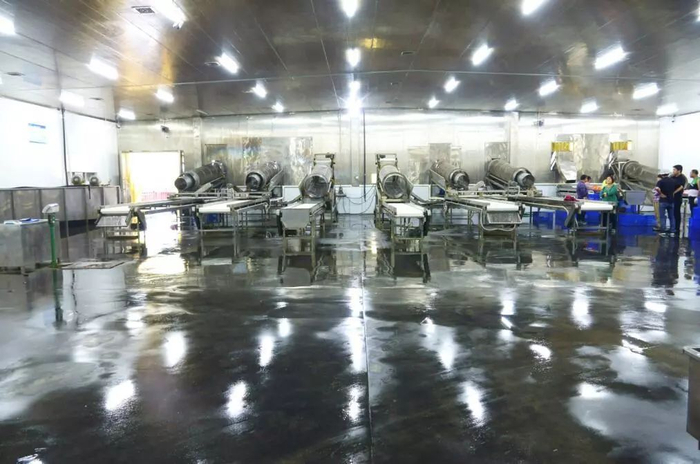 加工厂工人先将虾送上传送带进行分级,分级后的虾需要经过超声波和冲水等几道清洗程序,之后,还将进行风干、油炸,油炸后的小龙虾看起来红通通,令人顿生食欲。油炸后,小龙虾还需进入冰水和常温冷却。冷却后,小龙虾被送往两条不同的生产线,一条是生产清水虾,一条是生产虾仁。清水虾主要出口欧美,虾仁线需要工人手剥虾仁,因此全程无菌操作。