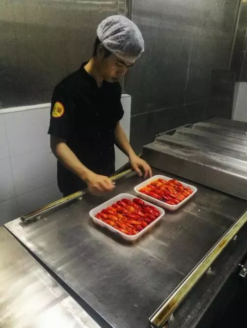 经过油炸后,小龙虾会进入冰水和常温冷却,之后将进行摆盘装袋。