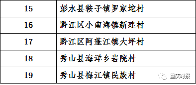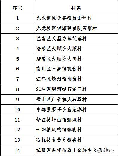 按照地域统计主城3个、渝西6个、渝东北3个、渝东南16个,其中有17个村已被评为中国传统村落、中国少数民族特色村落或景观旅游名村等。
