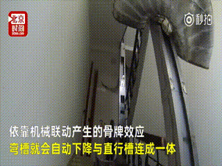 考虑到火灾发生时不可使用电力启动装置,因此周大爷将逃生滑梯设计成依靠机械联动产生的骨牌效应,使用时弯槽会自动下降与直行槽连成一体。
