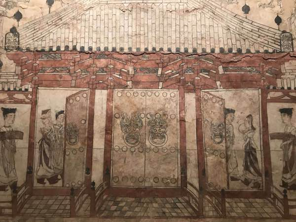 在上海博物馆的展览现场,《忻州九原岗北朝壁画墓墓道北壁壁画》被安放在一个层高5米的独立展厅中。上博提供了观众远观壁画上规模宏大的木结构建筑的足够空间,通过这座两侧有廊相连的庑殿顶三开间门楼,今人可知北魏宫门之概,这也是首次在同时期墓葬壁画中发现木结构建筑。与此同时,观众更可以走进壁画,看线条的韵味和门中顾盼相视的女子的形貌衣着细节。