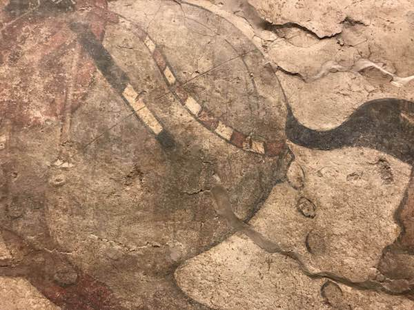 展览现场的《忻州九原岗北朝壁画墓墓道北壁壁画》仅半人高的玻璃之隔