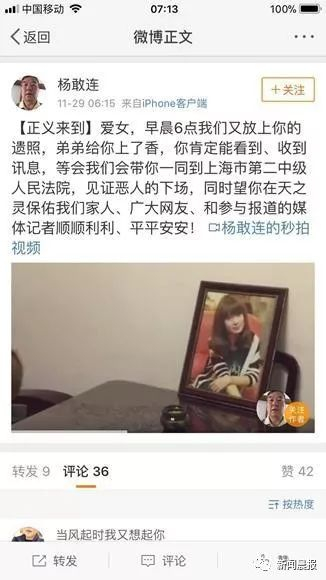 ▲11月29日,早上六点,被害人杨某某的父亲发布微博称,会带女儿一起去庭审现场。