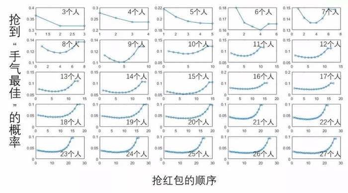 这张图可以说是微信抢红包里面包罗万象,它把所有的情况都概括了。它统计出了从3个人抢到27个人抢,如果你愿意的话,我可以统计到任何多个人抢。从3个人到27个人,不同的人在抢红包的时候,每一个位置抢到手气最佳的概率这个变化究竟是什么样子的。