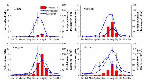 图1.雅鲁藏布江干流四个水文站的月均降水量、径流量、输沙量。