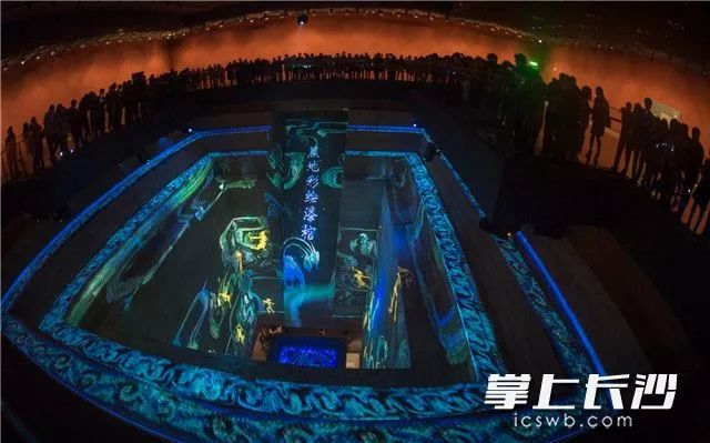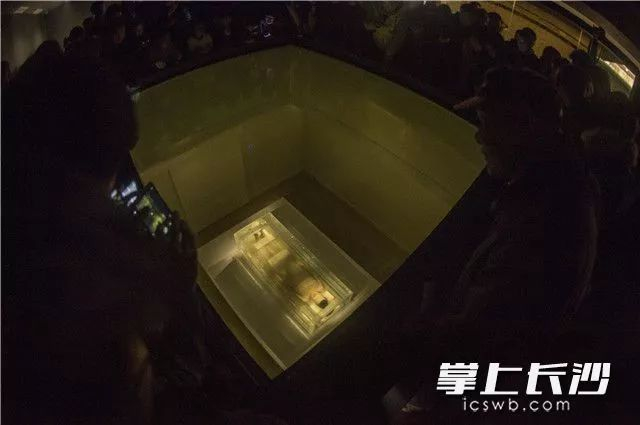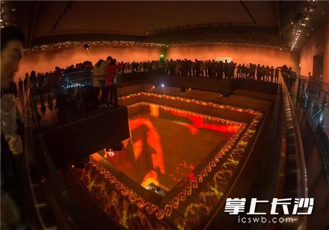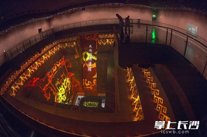 湖南博物馆新馆首次以1:1的比例复原了辛追墓,四周“墓壁”上还动态呈现辛追的漆棺。 长沙晚报记者 李锋 摄