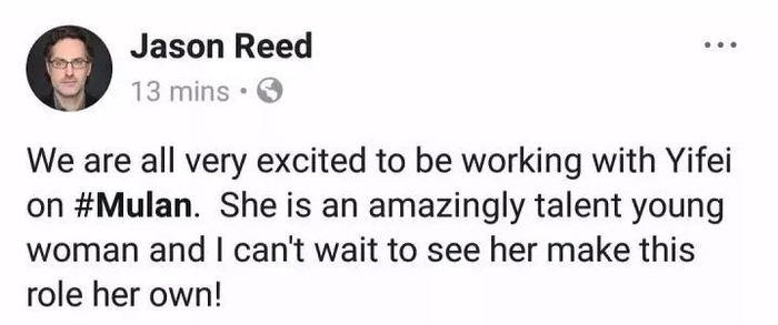 随后,迪士尼官方和《花木兰》制片人Jason Reed也盖章确认了消息。↓↓
