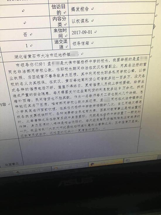 举报的内容为孟某挪用公款;任校长期间在武汉经营公司;因欠债百余万,以学校的名义贷款;在学校的建筑工程中收受贿赂等。