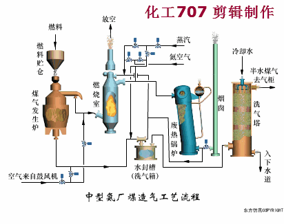 造气工段以碳(无烟煤或焦炭)、水蒸气、空气为原料,利用固体燃烧将水气分解,由此产生CO、H2、N2混合气体。