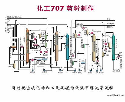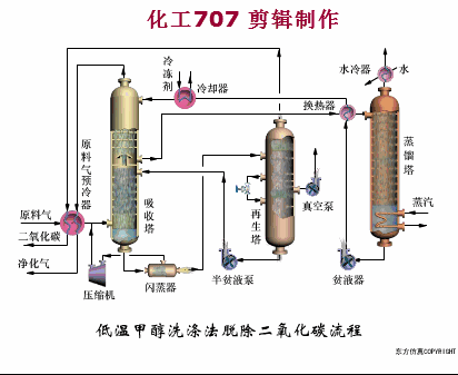为了防止原料气中的水蒸气在低温下结冰,向原料气中喷入少量甲醇,然后原料气经换热器中冷却,从分离器中分离出甲醇水溶液,经洗涤塔的底部进入塔内与上部下来的低温甲醇逆流接触,原料气中的硫化氢、二氧化碳等酸性气体被逐级除去。