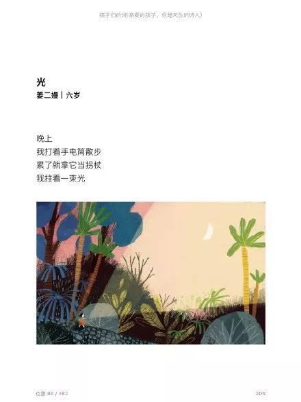 据出版方介绍,书中精选了七十多首等3到13岁小朋友写的诗。或许这些小朋友在写下这些诗句的时候,还不明白什么是诗,但他们用简单的语言,触动到我们。