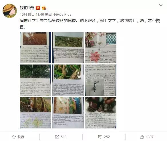 知名小学教师博主@我们1班 向同学布置了一个作业,让他们在周末去寻找身边秋的痕迹。