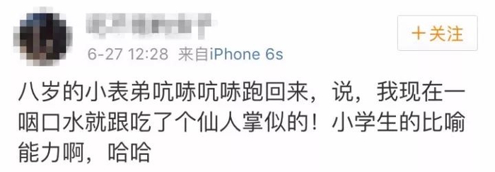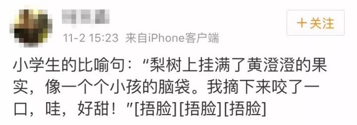 比如这条,把黄橙橙的梨子比作小孩的脑袋。如果只是以形比形,也就没什么说的。但后面又加了一句“哇,好甜”,味和形一下子就立体俏皮了。