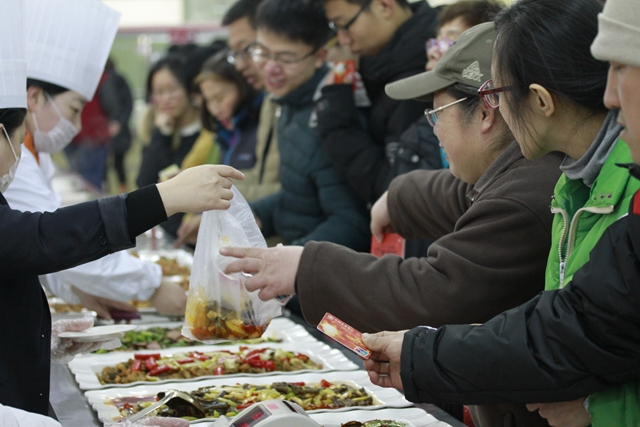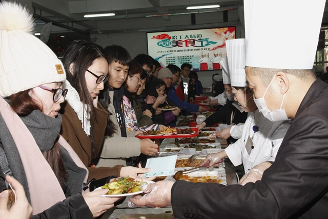 哈工大报讯(刘忠奎/文 兰锐/图)11月27日11时15分,走进学苑食堂一楼大厅,远远就闻到麻辣鲜香的美味,展台前挤满了人,原来是后勤集团饮食中心正在举办川菜美食周交流活动,只见展台上摆放着琳琅满目品种丰富的特色川菜,吸引了众多师生前来光顾品尝。