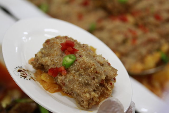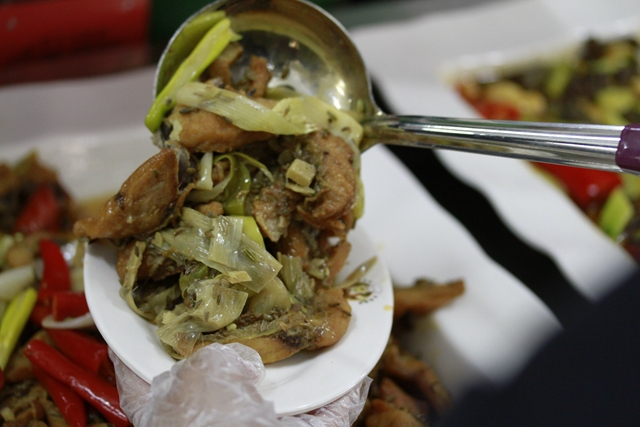 现场好不热闹,展台上摆放着酸酸辣辣的酸菜鱼、香辣爽口飘着红油的水煮肉片、松软香甜的糯米蒸排骨、麻辣爽口的麻婆豆腐、绵软不腻的粉蒸肉、劲道微辣的牛肚……冒着热气、散发缕缕香味的川菜勾起了师生们的食欲,他们早已排起了长长的队伍纷纷购买。