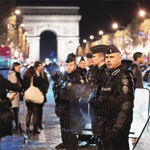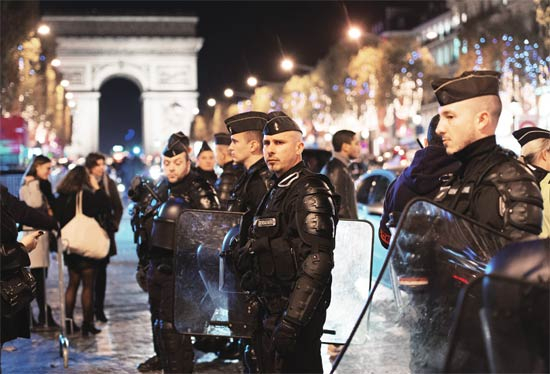 11月22日,巴黎香榭丽舍大街举行点亮圣诞节灯光的仪式,警察全副武装维护治安。图片来源CFP