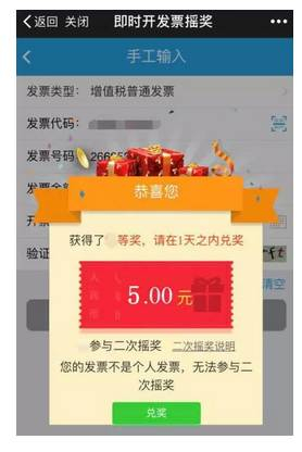 点击摇奖页面“扫一扫”,扫描发票左上角二维码,然后输入验证码,点击参与摇奖即可。