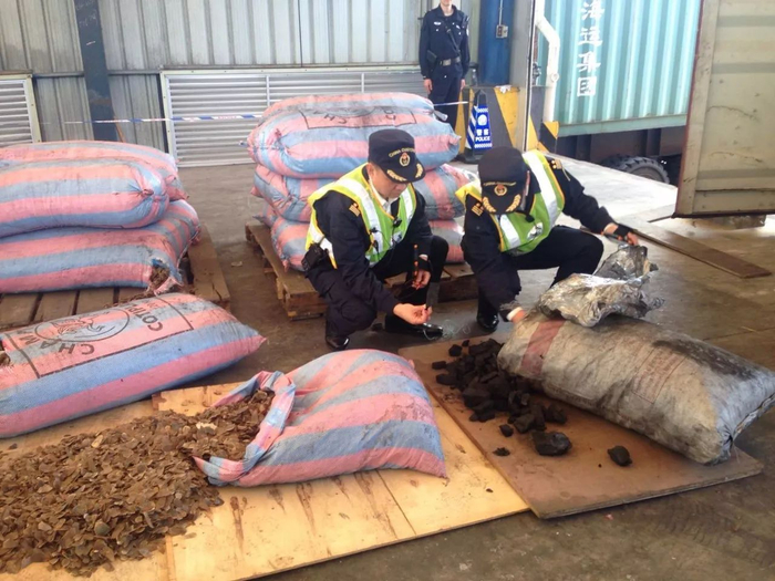 今年7月1日,一个向海关申报为“空柜”的集装箱从盐田港卸船准备入境。经海关开箱查验,所谓“空柜”实际不空,箱内藏有176包共计5.1吨木炭,还有239包货物疑似穿山甲鳞片,净重达到11.9吨,散发着浓烈刺鼻的腐臭味。