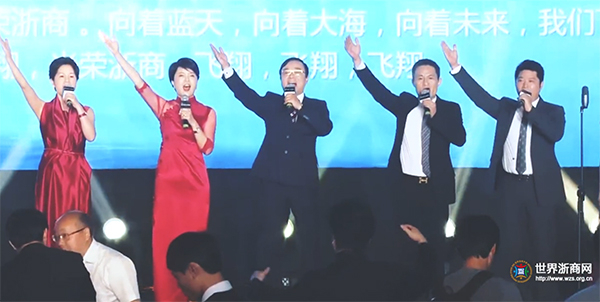 “走千山,行万水,敢为人先铸就浙江形象;说千言,吃万苦,勇立潮头开拓新路宽广……飞翔,风云浙商;飞翔,光荣浙商。向着蓝天,向着大海,向着未来……”