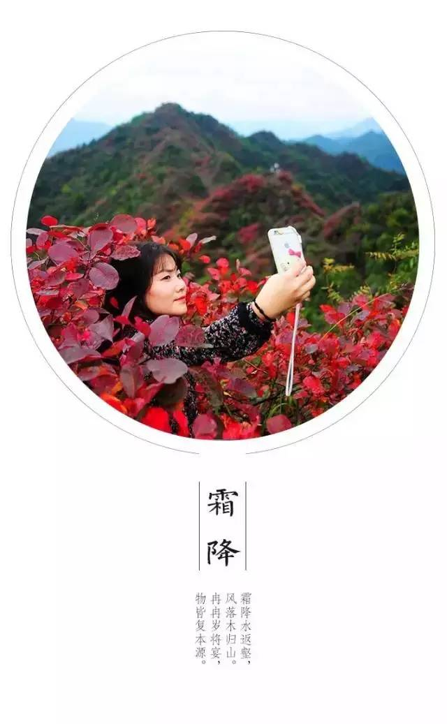 霜降:“霜降三旬后,蓂馀一叶秋。”每年10月23日前后迎“霜降”。天气渐冷,开始有霜。作物、草木开始泛黄、落叶,进入了“千树扫作一番黄”的暮秋、残秋和晚秋。