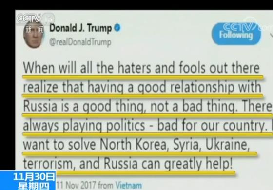不过,美国总统特朗普多次发出不同声音,他本月12号在越南参加APEC峰会时强调,应与俄罗斯建立友好关系。他发推特说:“什么时候大家才能认识到,同俄罗斯搞好关系是一件好事呢?不要玩什么政治游戏了,对美国无益。我要解决朝鲜、叙利亚、乌克兰、恐怖主义等问题,俄罗斯都能帮上忙的!”