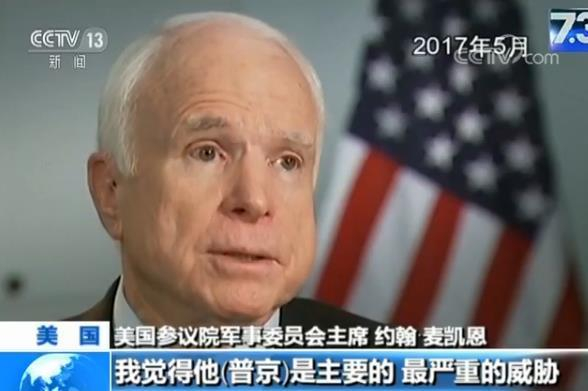 美国参议院军事委员会主席 约翰·麦凯恩:我觉得他(普京)是主要的,最严重的威胁,比极端组织更加严重。俄罗斯人想要摧毁美国民主的基础,改变美国选举的结果。