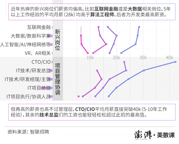 但是,再高的薪资也高不过管理层,CTO/CIO的平均月薪直接突破40000元(5-10年工作经验)。