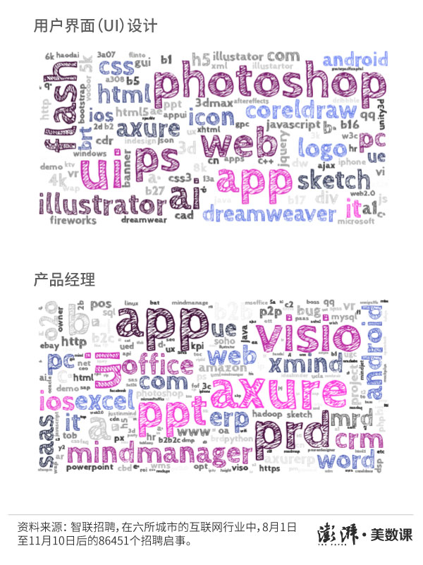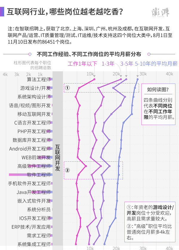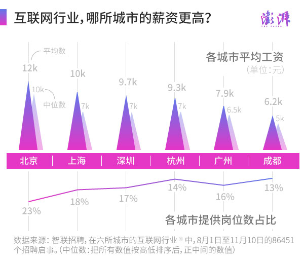 那么互联网行业的工资有多高?什么岗位越老越吃香?不同岗位的专业技能要求又有些什么?澎湃新闻(thepaper.cn)抓取了今年8月1日至11月10日之间,智联招聘平台上发布的86451个互联网行业(注①)岗位招聘信息(工作地点在北京、上海、深圳、广州、杭州以及成都这六所城市),试图来更好地解答这些问题。
