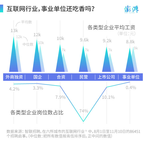 二十年前找工作时,最引以为豪应该就是捧上铁饭碗,吃上“单位”饭。然而在如今的互联网+时代,就薪资来讲,事业单位的月薪水平便低了一大截;就工作岗位数来说,大部分的互联网岗位均由民营企业提供,占74%。