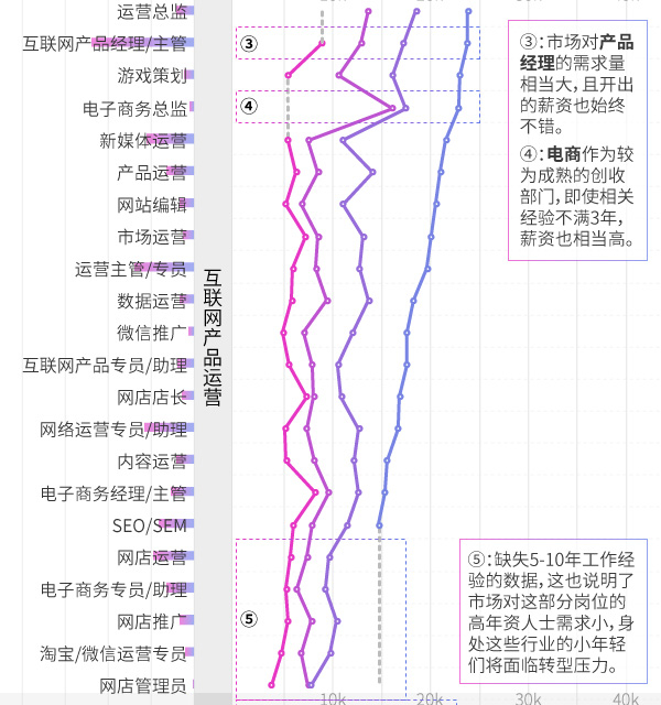 整体上看,大部分岗位的起薪水平相差不大,但随着经验的积累,互联网开发类的高薪职位数明显高于设计、运维类岗位。产品经理虽然在后期比不上部分开发类工程师,但市场需求量远远大于后者。