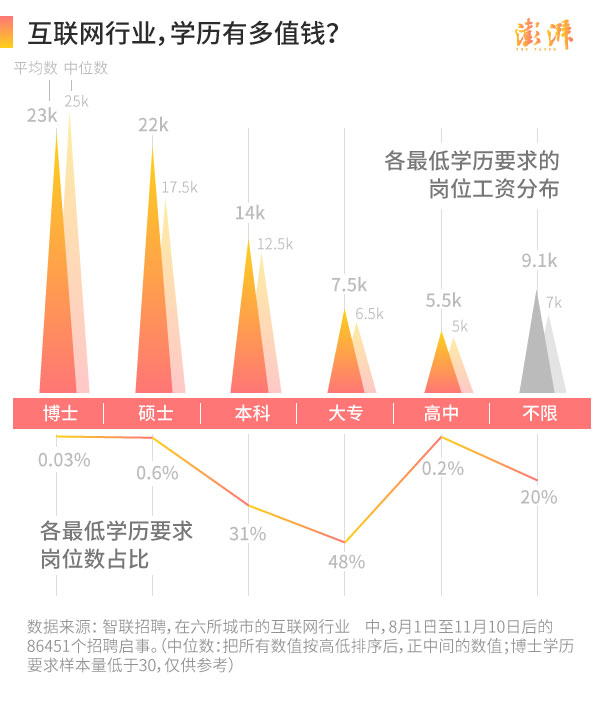 随着大学扩招,房价一轮轮疯涨,人们对学历含金量的质疑甚嚣尘上。那如今,高学历是否更值钱呢?答案是肯定的。最低要求为本科的岗位平均月薪已达14000元,要求硕士学历的岗位对应的平均月薪达到22000元,而八万多个样本的整体平均月薪为9600元。当然,这并不是说你有了相应学历,月薪便能达到这个数字,毕竟许多本科毕业生所从事的工作对应的学历要求也许只是大专或更低学历。