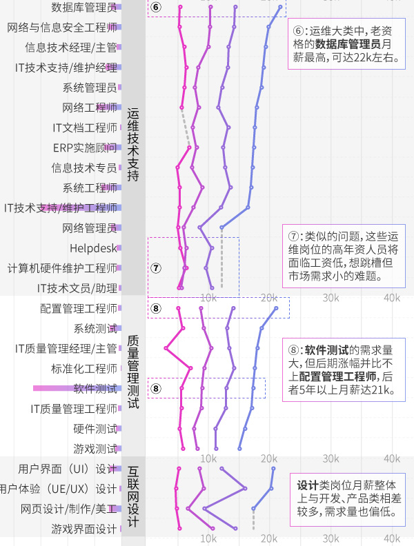 与此同时,一部分运维以及电商岗位显示出后劲不足的势头,例如硬件维护工程师、电商助理等,市场对拥有多年经验的此类从业者需求小,工资涨幅也偏小。