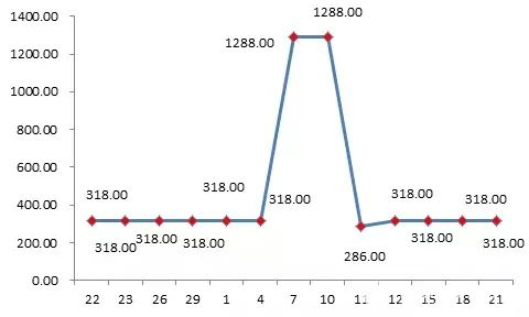 某全棉四件套,“双11”前销售价格由318元大幅提高到1288元,“双11”活动期间又将价格大幅调低到286元,打折力度明显“增大”: