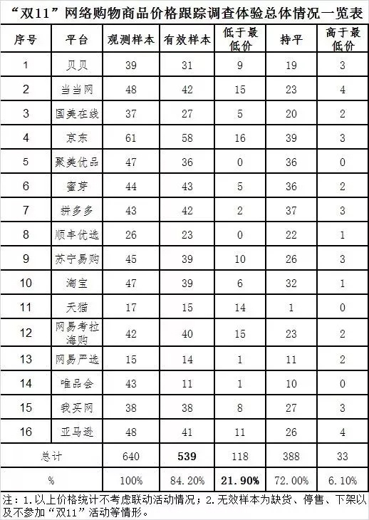 《报告》显示,在今年宣称参加“双11”促销活动的539款非预售商品中,不在11月11日也能以“双11”价格或更低价格(不考虑联动活动情况)购买到促销商品的比例达78.1%,与2016年同期相比有所增加。先涨价后降价、虚构“原价”、随意标注价格的情况较为突出。
