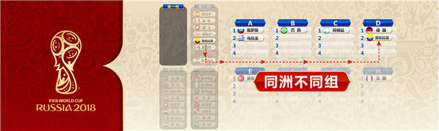 和以往一样,属于同一大洲球队应遵循回避原则,也就是说,假设第一档的巴西队、阿根廷队分别确定为B组和C组,那么第二档中同属南美洲的哥伦比亚队,如果第二个被抽到,就必须跳过B组和C组,直接进入D组。