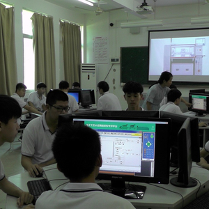 学生使用仿真软件操作自动贴片机。
