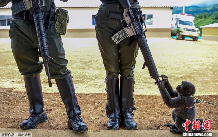 当地时间10月25日,哥伦比亚武装游击队接受培训,一只宠物猴子在玩弄警察的枪。