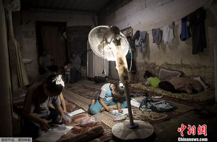 当地时间2017年9月11日,加沙城,巴勒斯坦儿童在停电时做家庭作业。在过去两周,180万加沙居民经历了长时间的停电。