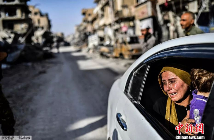 当地时间2017年10月20日,叙利亚拉卡,一名妇女在看到自己的房子时哭泣。由美国支持的叙利亚民主力量(SDF)日前声称,他们已经完全收复了“伊斯兰国”极端组织的“首都”拉卡。