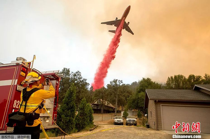 当地时间2017年7月19日,美国加州马里波萨市,飞机投放阻燃剂。当地发生的火灾烧毁超过4.5万英亩土地,摧毁8栋建筑。