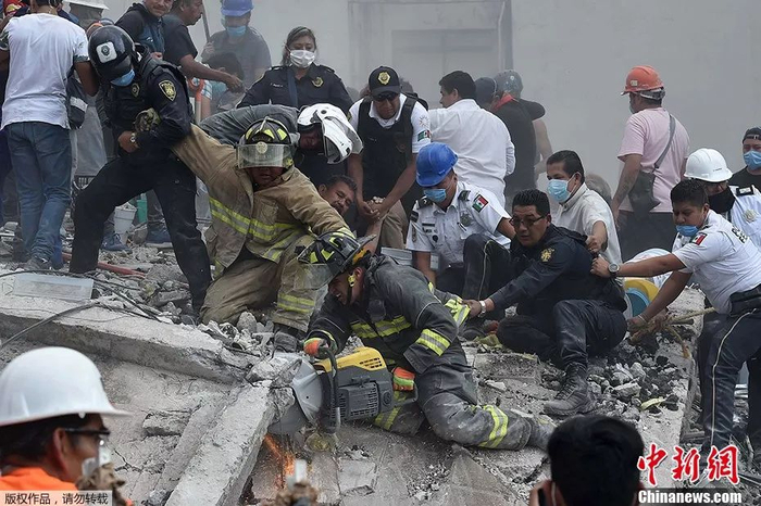 当地时间2017年9月19日,墨西哥首都墨西哥城,救援人员、消防员、警察、士兵和志愿者在废墟上搜救幸存者。墨西哥在一个月内发生两次强烈地震,造成重大伤亡。