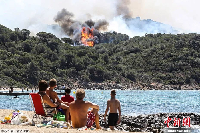 当地时间2017年7月25日,法国拉克鲁瓦瓦尔默,在海滩休闲的人们看向附近的森林大火。在法国东南部地区,消防员与大火的搏斗进入了第二天,在圣特罗佩茨的一度假村附近,一处大火失控。