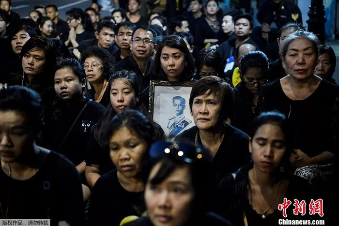 当地时间2017年10月29日,泰国曼谷,悼念者在泰国先王普密蓬骨灰从大皇宫转移到一座当地寺庙的仪式上为他祈祷。在他去世一年后,泰国为其举行了为期五天的盛大葬礼。