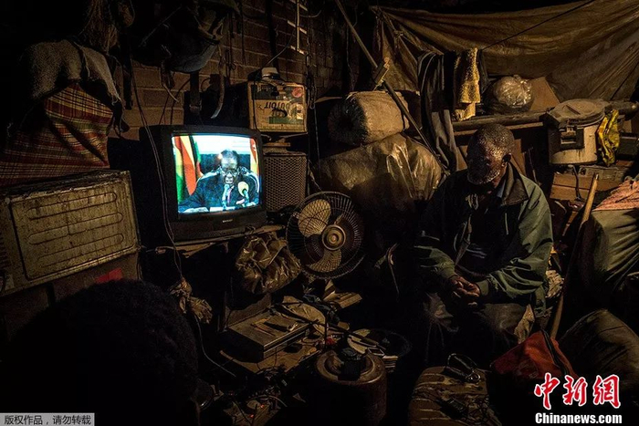 当地时间2017年11月19日,津巴布韦哈拉雷,一名男子在收看总统穆加贝的电视讲话。