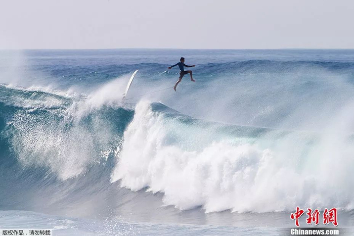 当地时间2017年1月13日,美国夏威夷,2017年Backdoor Shootout冲浪大赛在美国夏威夷欧胡岛举行。比赛中,来自美国纽约的参赛选手巴兰·斯塔克(Balaram Stack)脱离冲浪板,腾空跃起。