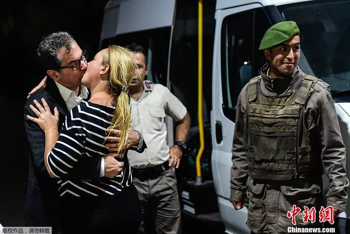 当地时间2017年9月26日,土耳其伊斯坦布尔,反对派报纸《共和报》编辑主任Kadri Gursel获释后亲吻妻子。